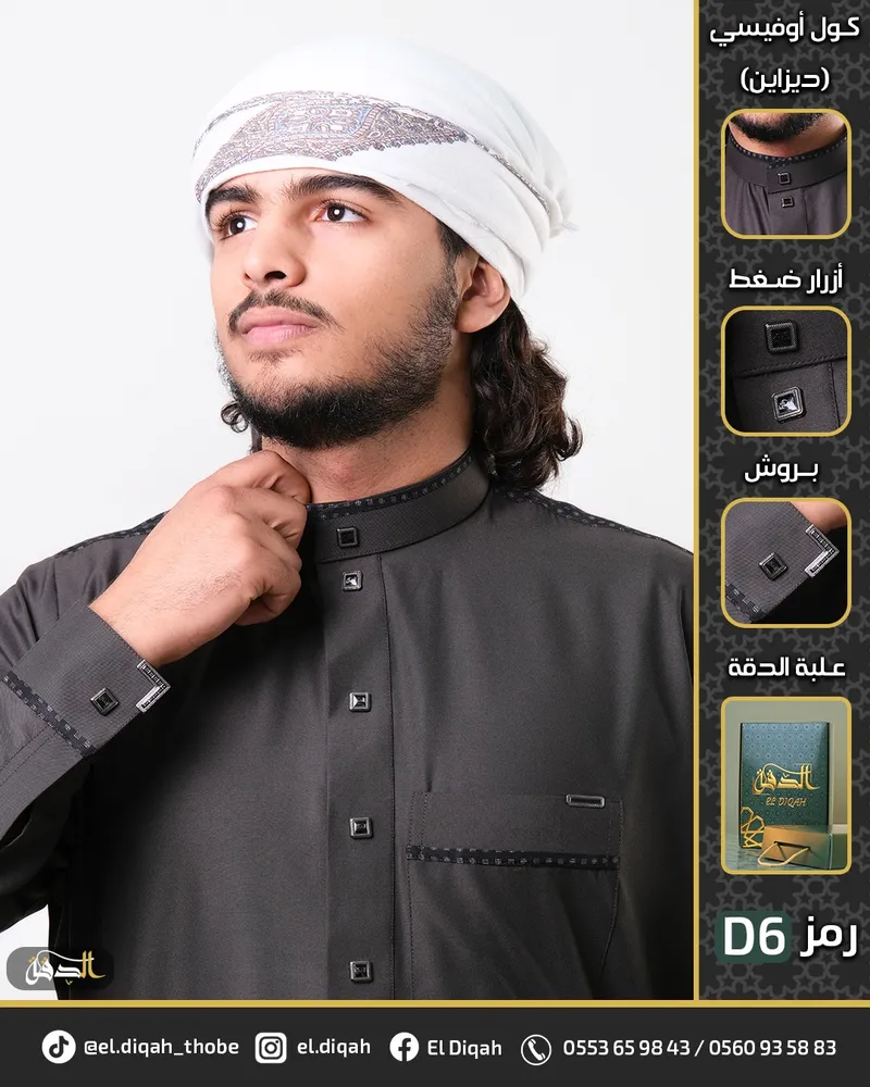 - تفاصيل متقونة: ياقة كول شوميز، زراير ضغط فخمة، و بروشات فضية تزيدو قيمة.